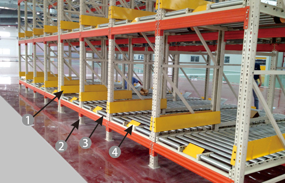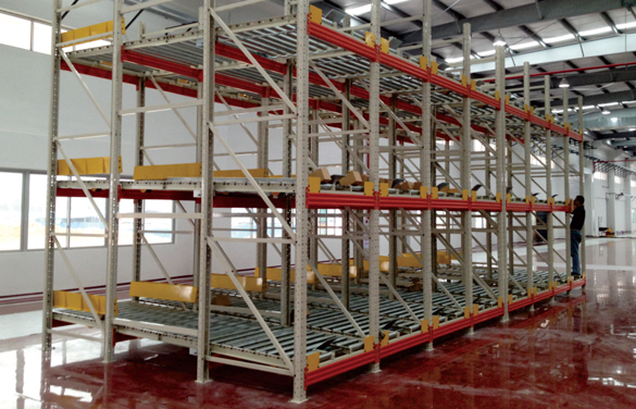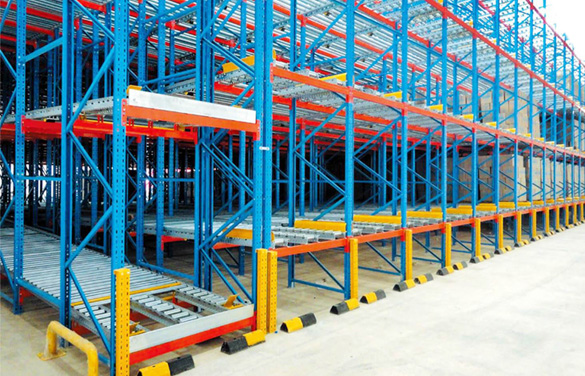 重力式貨架又稱為輥筒式貨架,采用輥子式軌道或底輪式托盤,軌道呈一定坡度(3°左右),利用貨物的自重,自動下滑,是一種節約空間、結構緊湊的系統。貨架區域不設內部通道,只有出貨和進貨通道,對于分揀貨物,這種系統是最快、最經濟的分揀系統。