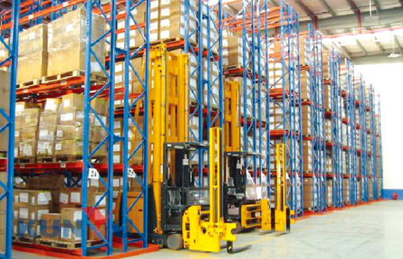 貨架系統(tǒng)主體為橫梁式貨架系統(tǒng),區(qū)別在于貨架底部地面上加裝“三向堆垛叉車”的行動(dòng)導(dǎo)軌。導(dǎo)軌常規(guī)采用不等邊角鋼。物料搬運(yùn)叉車限為專用的“三向堆垛叉車”。三向堆垛叉車沿既定導(dǎo)軌滑行。貨架系統(tǒng)的堆垛通道寬度稍大于托盤貨物的寬度,高密度的存儲(chǔ)需求得以實(shí)現(xiàn)。同時(shí)繼承了橫梁式貨架系統(tǒng)的所有優(yōu)點(diǎn),貨架系統(tǒng)所收納的所有物料均具備的可選性,叉車可隨時(shí)存儲(chǔ)任一托盤貨物??焖俚拇鎯?chǔ)效率,非常高的存儲(chǔ)密度,對(duì)于適合采用窄巷道貨架系統(tǒng)的存儲(chǔ)與物流中心來說,帶來的是顯著的生產(chǎn)效率與成本效益。